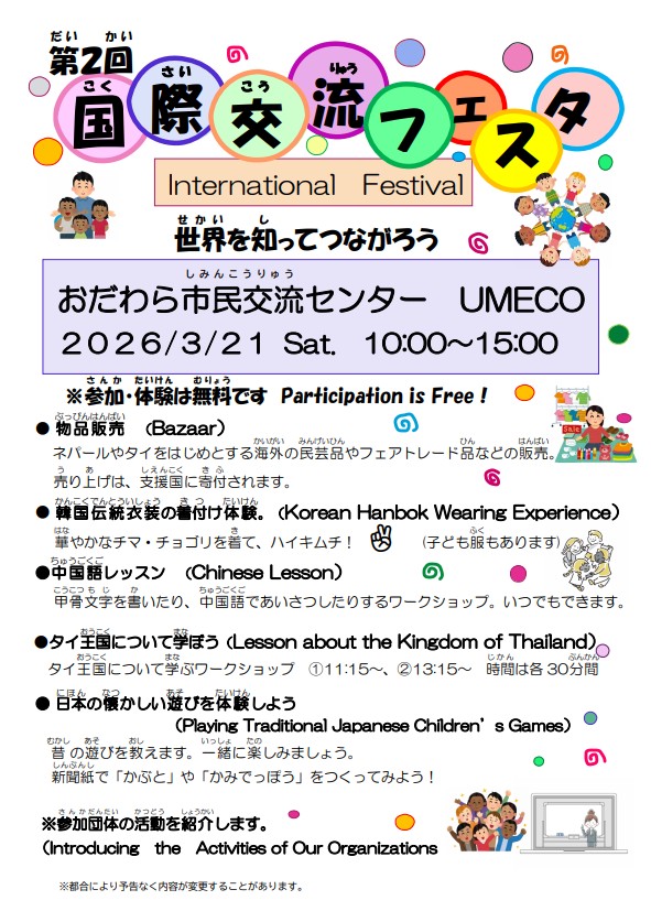 2026年3月8日(日) 新所沢まちづくりセンターにて「 第31回 所沢市国際交流フォーラム 」が開催されます。所沢市在住の外国人市民との交流を目的としたイベントで、外国人市民のスピーチや世界の音楽や踊り、世界の衣装の着付け体験等が楽しめます。