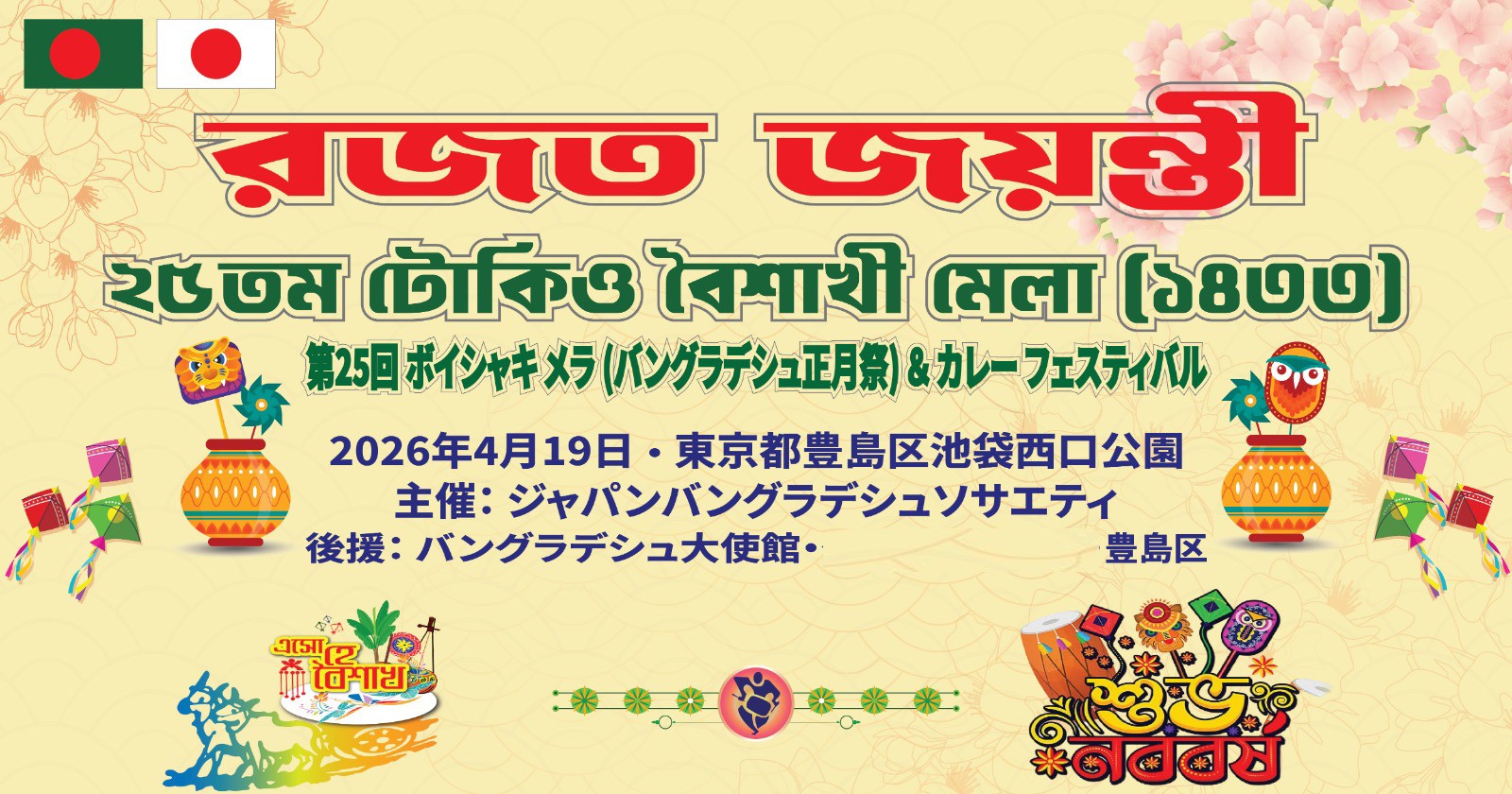 2026年4月19日(日) 池袋西口公園では「 第25回 カレーフェスティバル & バングラデシュ ボイシャキメラ 」が開催されます。バングラデシュのボイシャキメラ(お正月祭)をお祝いした、国内最大のバングラデシュイベントで、毎年バングラディッシュカレーの屋台や、伝統舞踊等が楽しめます。