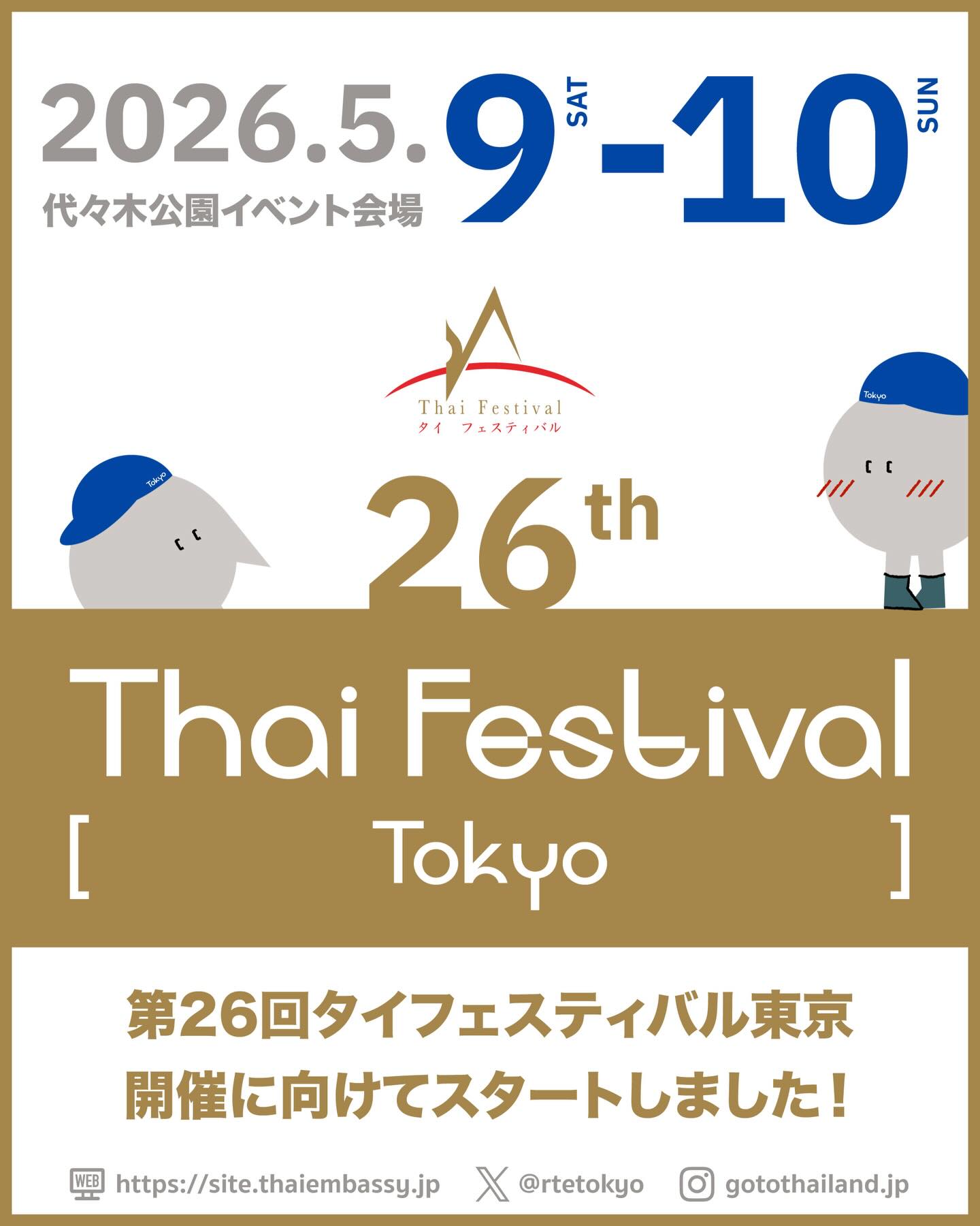 2026年5月9日(土)10日(日) 代々木公園イベント広場で「 タイフェスティバル東京 2026 」が開催!来場者約30万人を誇る日本最大級のタイのイベントで、美味しい本場のタイ料理や雑貨、エンターテイメントなど様々なタイのコンテンツが楽しめます。また、ステージにはタイの大スター達が多数出演予定です。