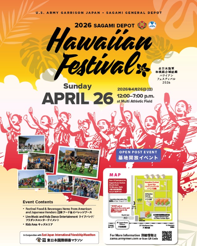 2026年4月26日(日) JR横浜線 相模原駅近くの相模デポ ( 在日米陸軍 相模総合補給廠 )で「 ハワイアンフェスティバル 2026 」が開催されます。米軍基地を一般開放して開催されるイベントで、フラダンス、日米フード&ビバレッジブース、キッズエリア等が楽しめます。