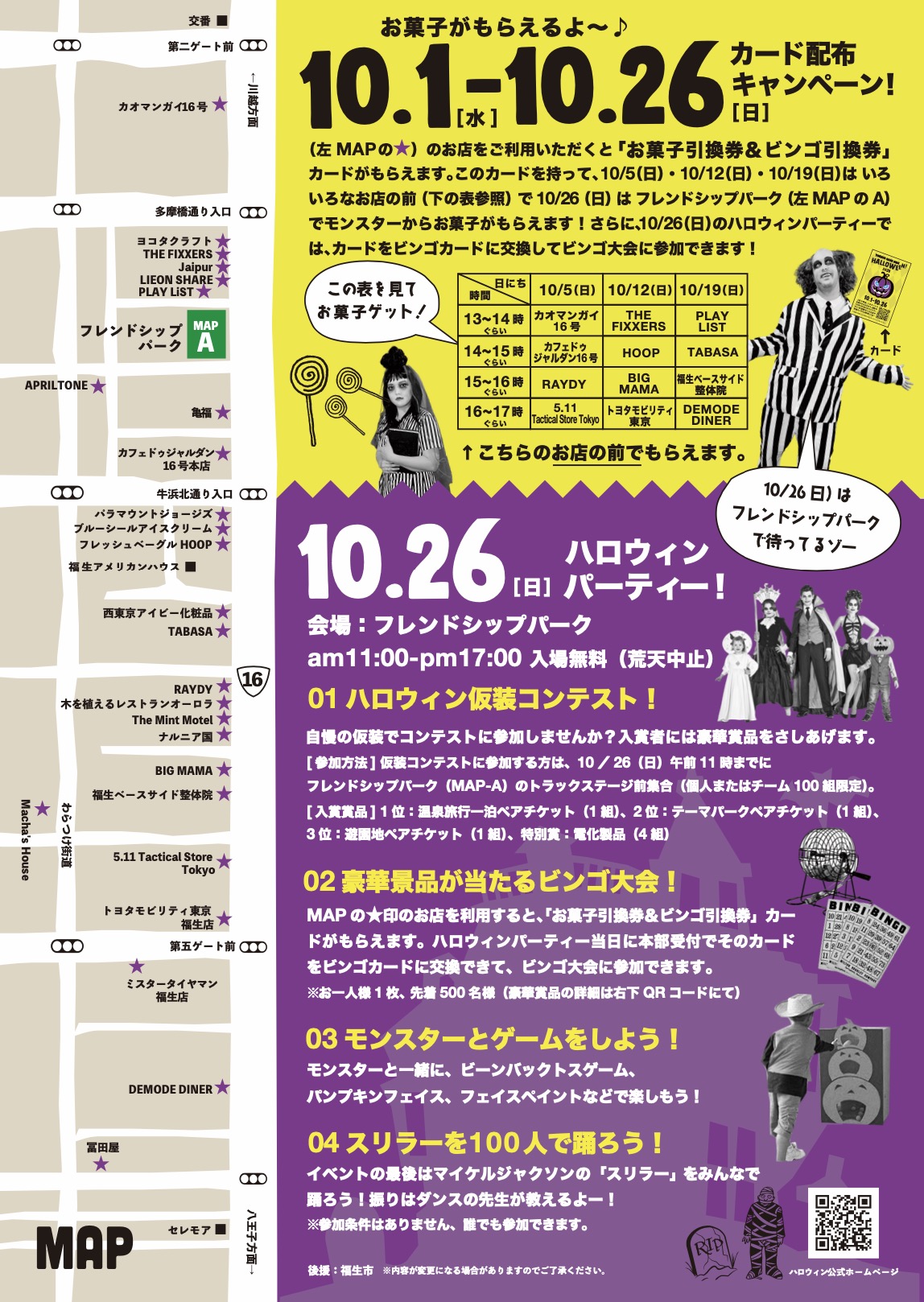 上記MAP の印のお店を利用すると、「お菓子引換券&ビンゴ引換券」 カー ドがもらえます。 ハロウィンパーティー当日に本部受付でそのカード をビンゴカードに交換できて、ビンゴ大会に参加できます。