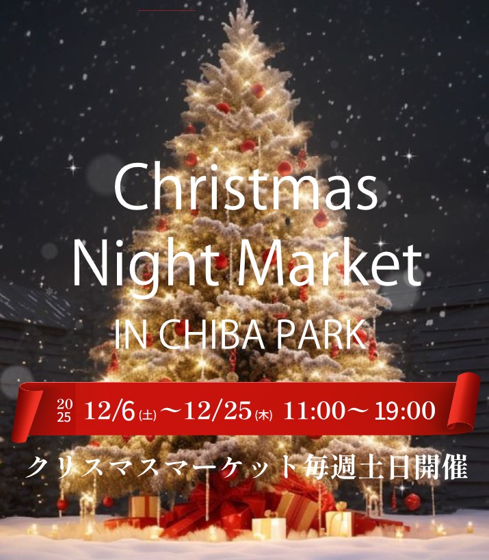 2025年12月6日(土)〜25日(木)の期間 千葉公園で「 Christmas Night Market 」と題し毎週土日にクリスマスマーケットが開催されます。巨大ツリーやイルミネーションで彩られた幻想的な空間で、北欧雑貨等の商品を販売するマーケットや、クリスマスに因んだグルメがいっぱいのフードフェス等が楽しめます。