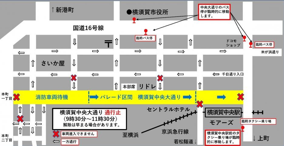●横須賀中央大通りは上下線通行止め(9時30分~11時30分)となります。