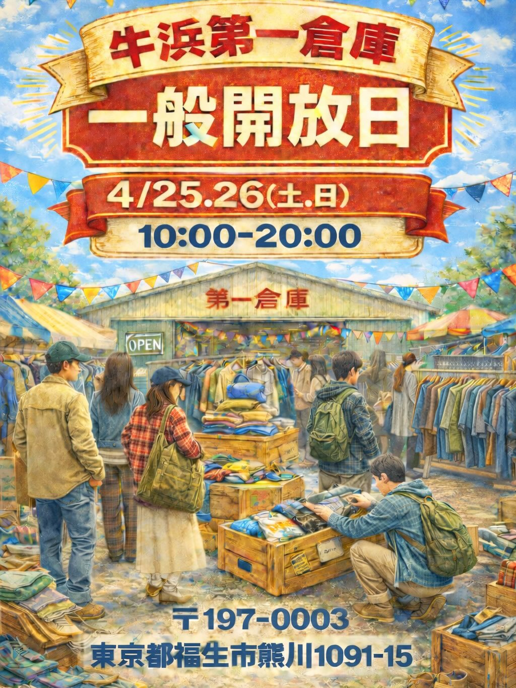2026年4月25日(土)26日(日) の2日間、横田基地のすぐそば、ヤマヒサ古着倉庫「牛浜第一倉庫」が一般開放されます。