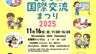 その他の国際イベント 2025年11月16日(日) むさしの国際交流まつり 2025 @ 武蔵野スイングビル 2025年11月16日(日) 武蔵境の武蔵野スイングビルでは「 むさしの国際交流まつり 2025 」が開催されます。いろいろな国のたべものを体験できる「多文化カフェ」や、手作り体験 ゲームで交流が出来る「多文化体験パーク」、民族音楽ステージや和太鼓の演奏が楽しめる「 多文化ステージ」等が行われます。 2025.10.16 その他の国際イベント